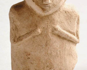 Human-Ram Deity from Sidon. With human features as well as the eyebrows, nose and horns of a ram, this painted limestone figurine represents a deity
