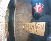 Unknown man wearing satanic mask holding sign with apocalyptic Bible verse